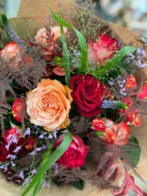 Beautiful mixed coloured roses and seasonal flowers create this beautiful, natural feel bouquet.